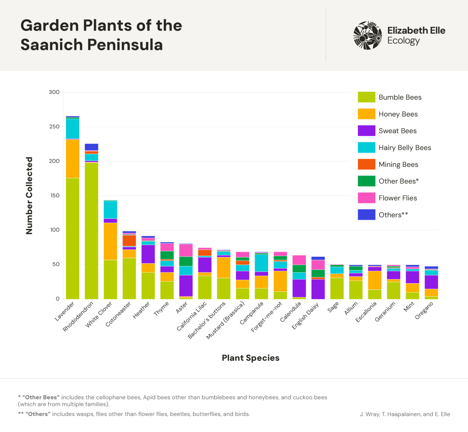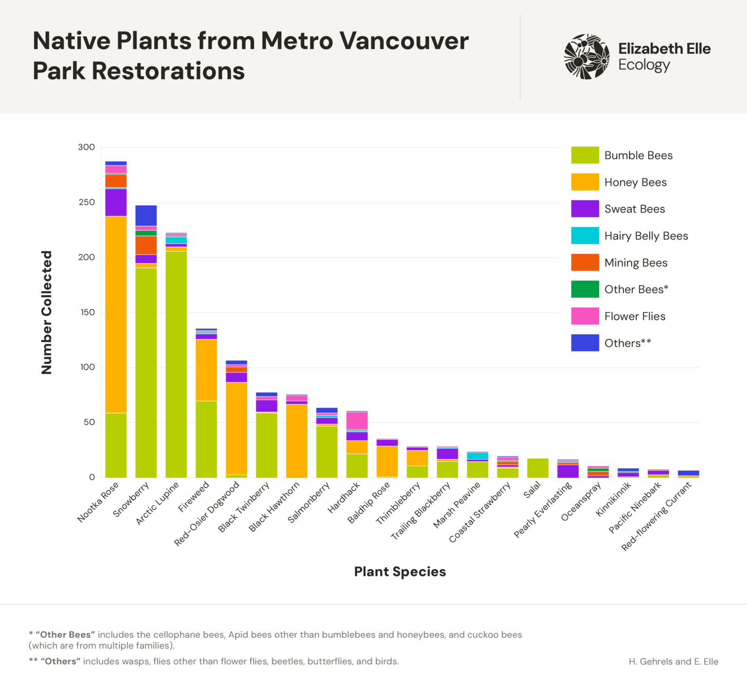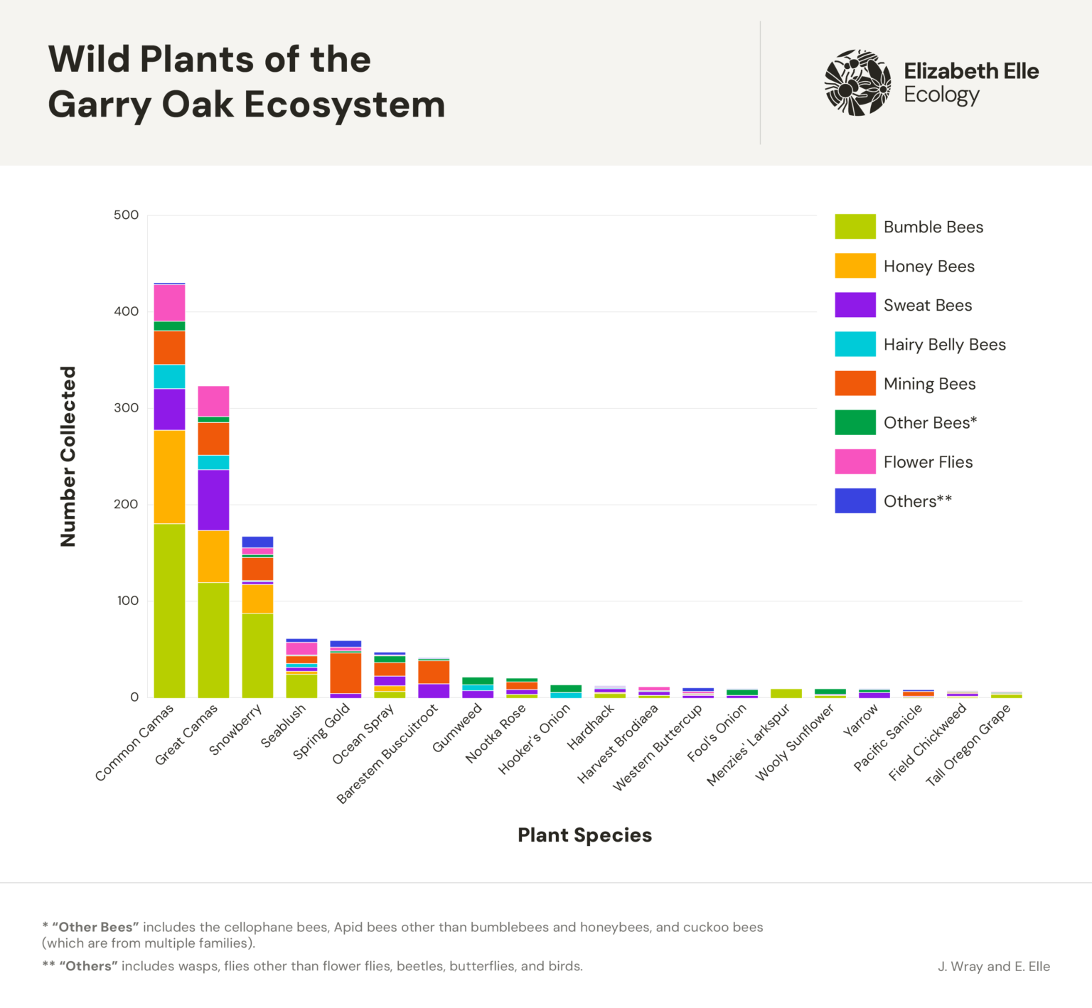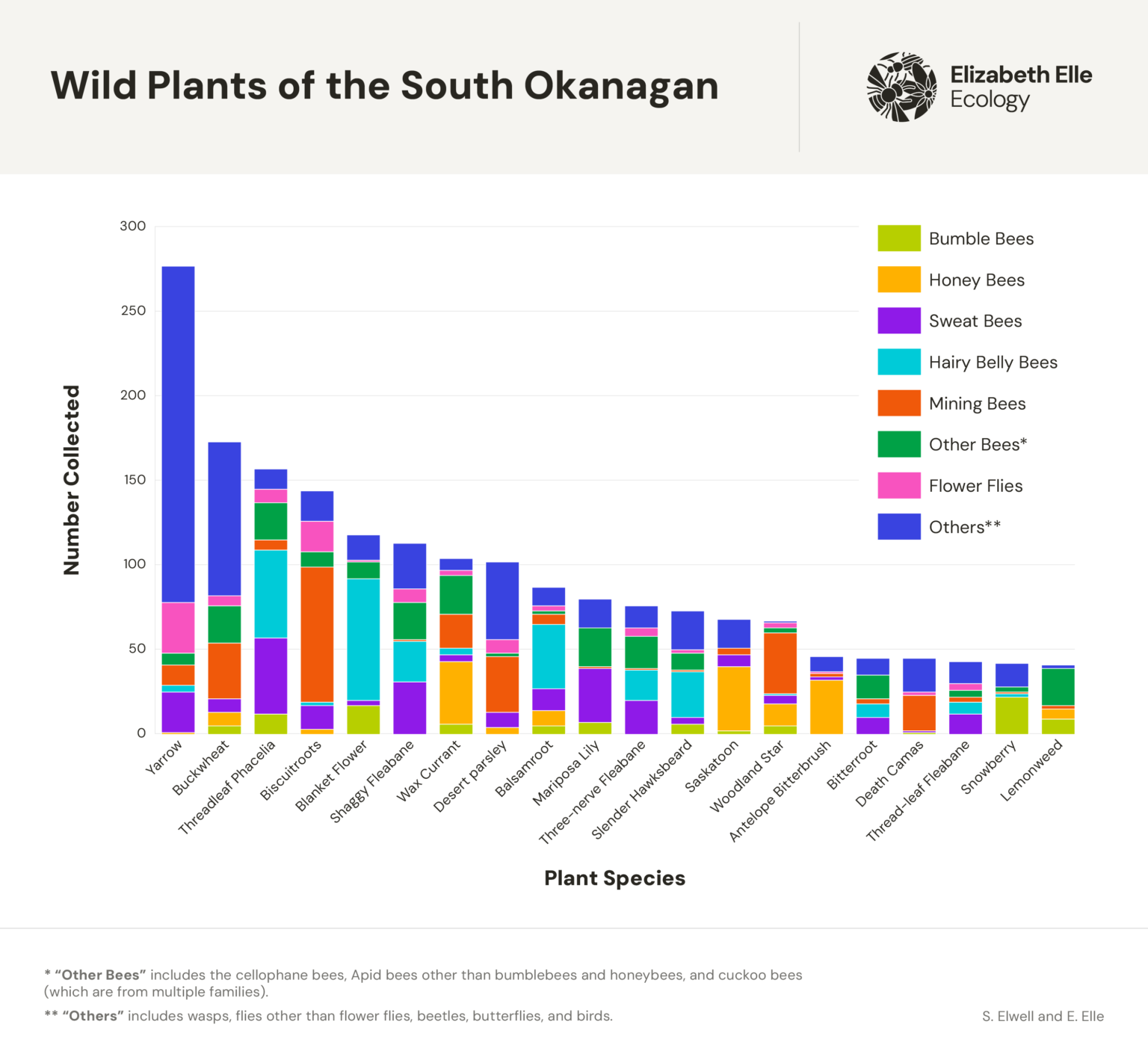The colours indicate pollinator type, and each bar is for a different plant. These “top-20” lists show which plants had really high visit rates by pollinators, and also useful is that bars with lots of different colours attract many different pollinator types. Note that the data hasn’t been standardized by flower number, so some common plants will be over-represented in our data.