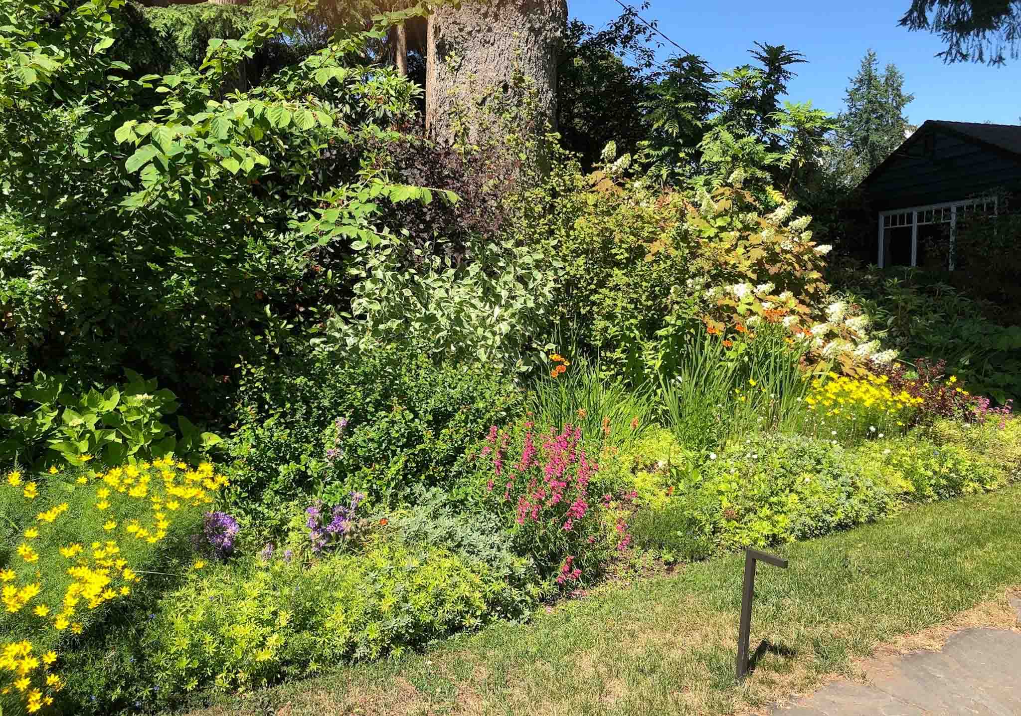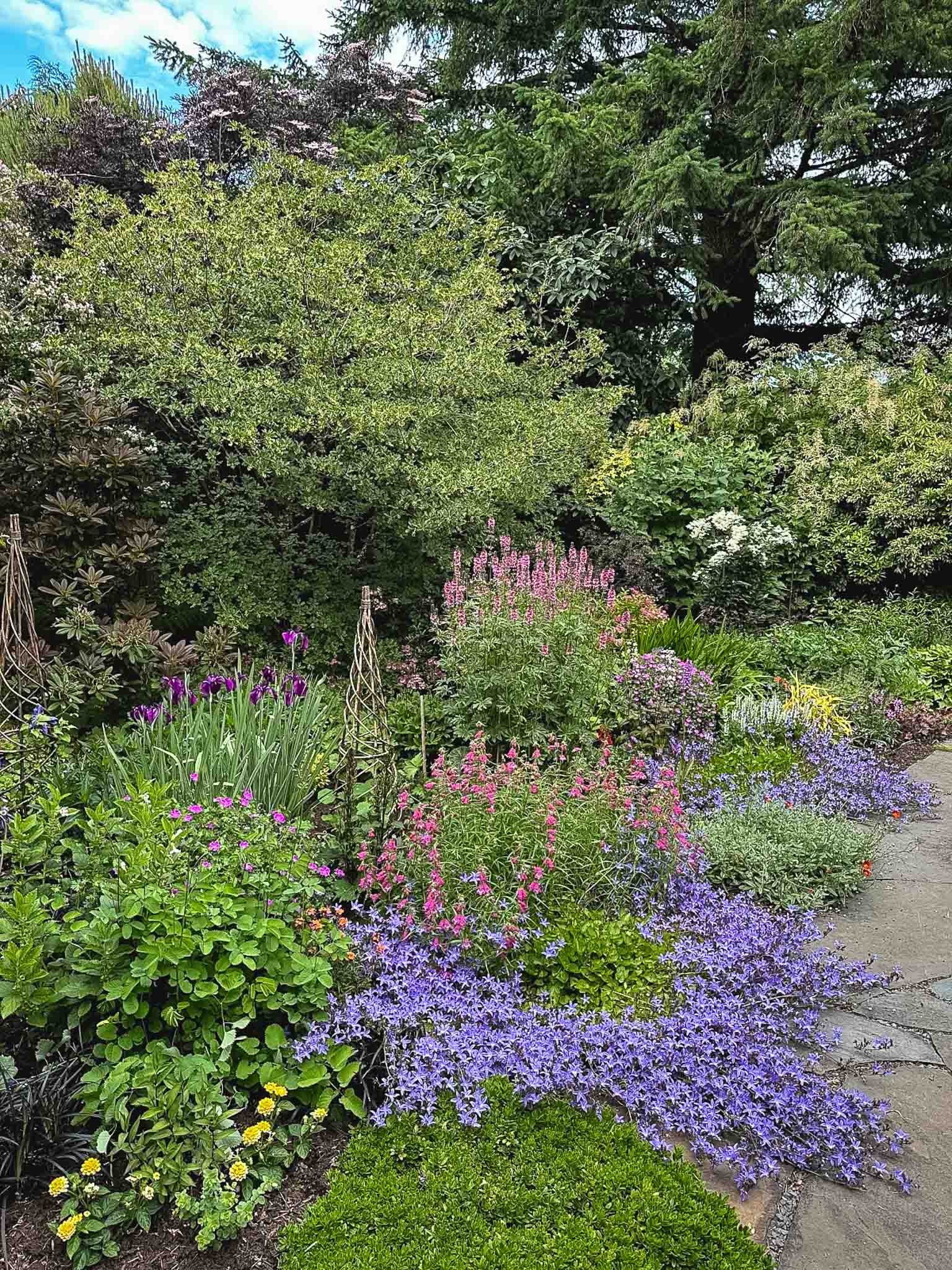 Image 1: Notice the variation in flower types: penstemon (pink, tube) campanula (purple, bell), geranium (fuschia, open); ground virgin’s bower and ocean spray in the back (white, lacy).