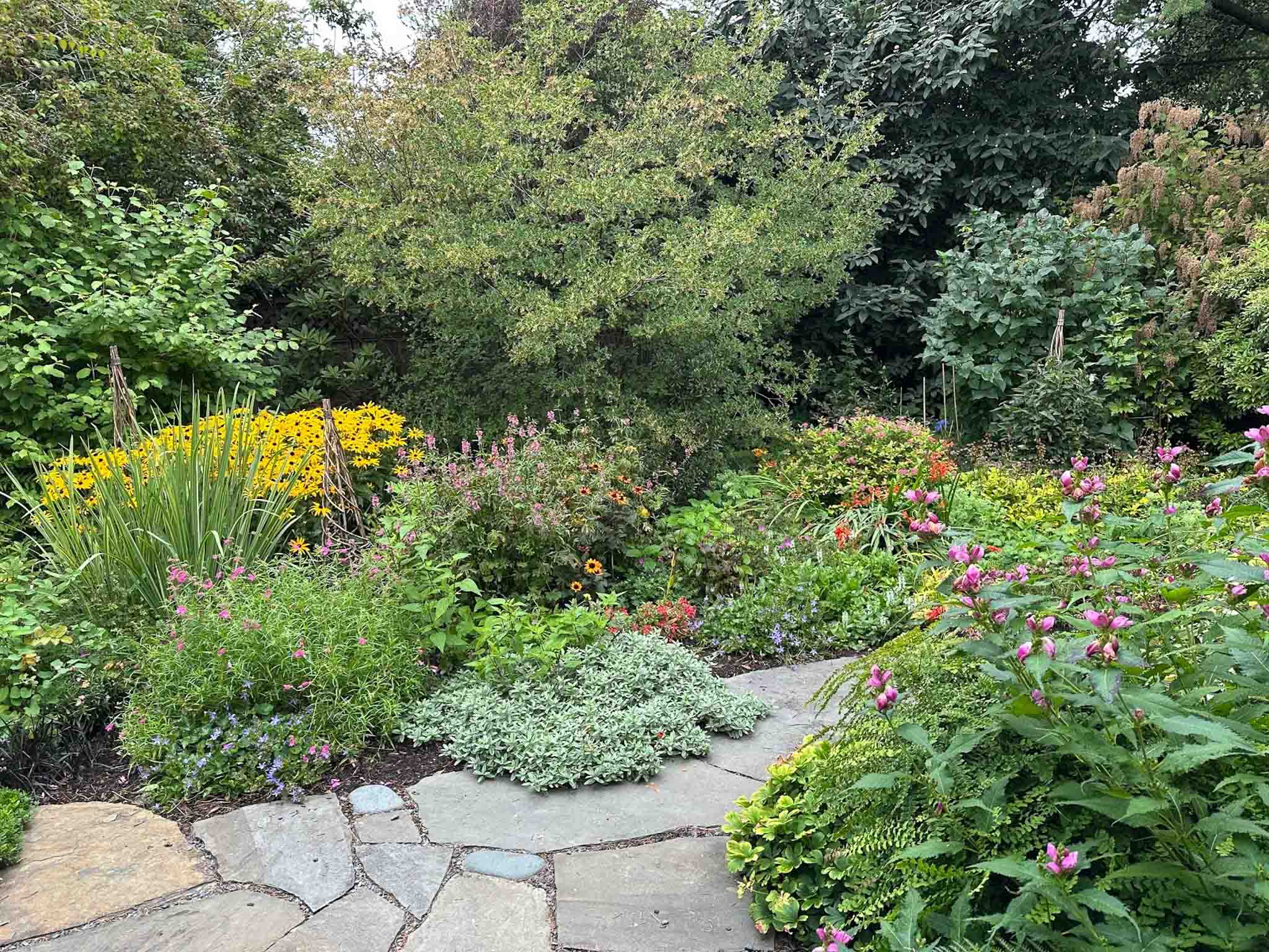 Image 2: The same garden from a different angle later in summer: black eyed susan (yellow daisy); crocosmia (orange, bell); turtlehead (pink, bilabiate)