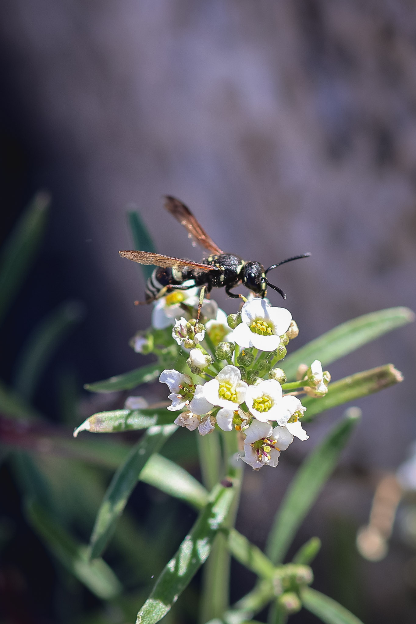 Wasps: Diverse wasps visit flowers for nectar, and all wasp larvae are carnivores, often fed garden pests like caterpillars and katydids. Wasps have many different nest types and can be solitary or social. They are closely related to bees and may resemble them, though often have narrow “wasp waists”.