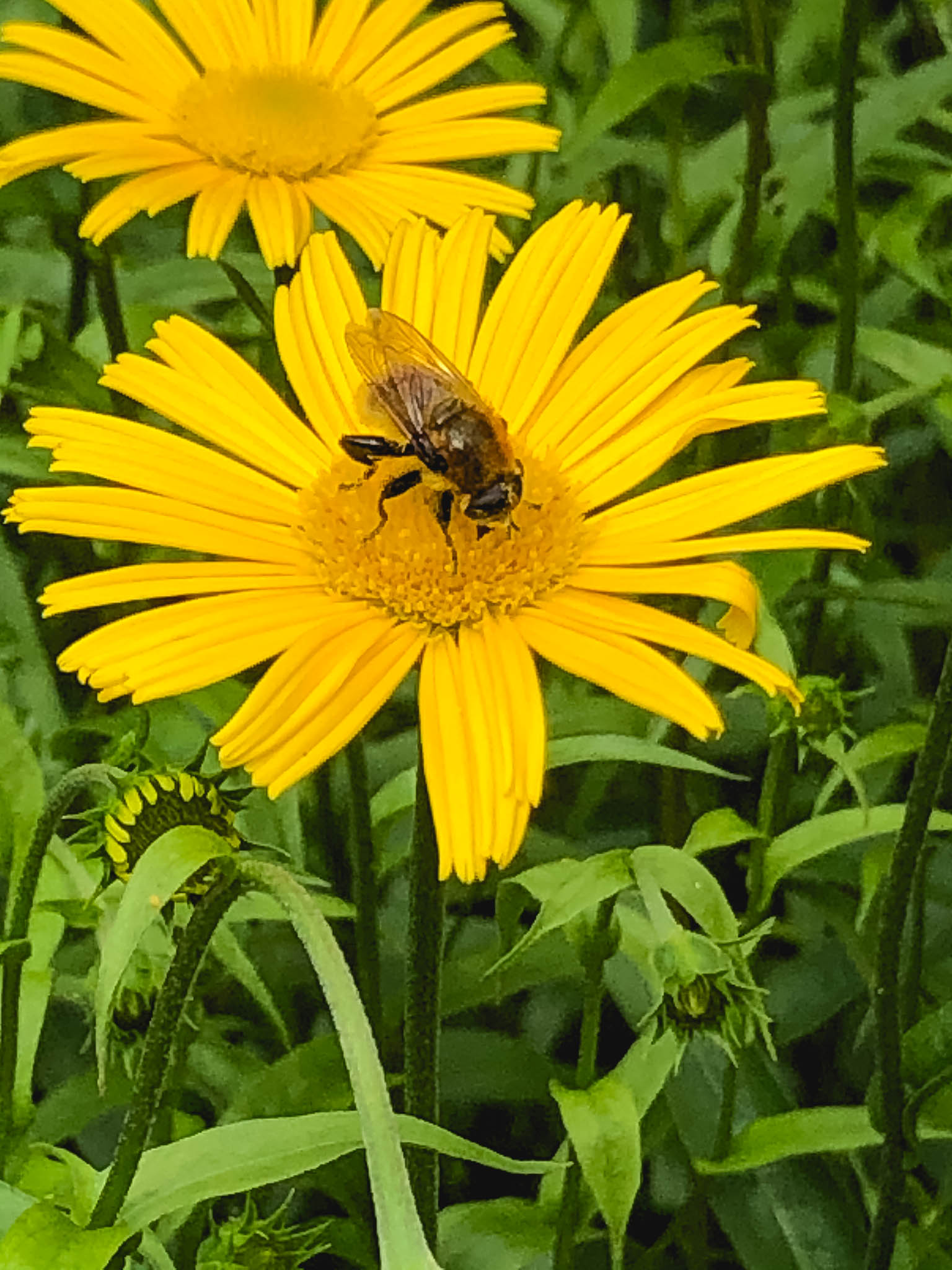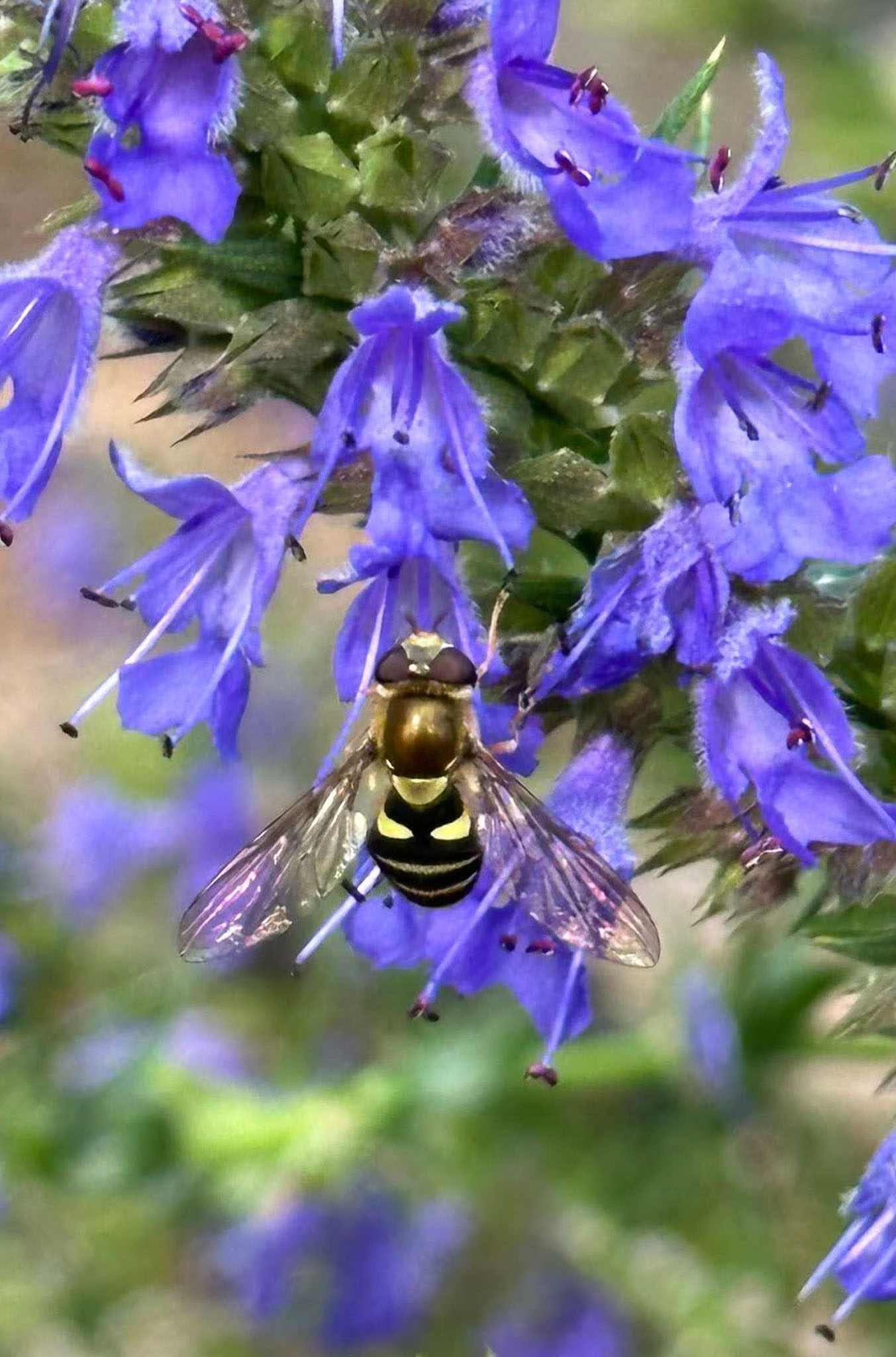 Flower Flies: Common flower visitors, many flower flies mimic bees or wasps. Their larvae are often predators of garden pests, like aphids! You can recognize a fly because it has just two wings (bees and wasps have four) and big bulging insect eyes.