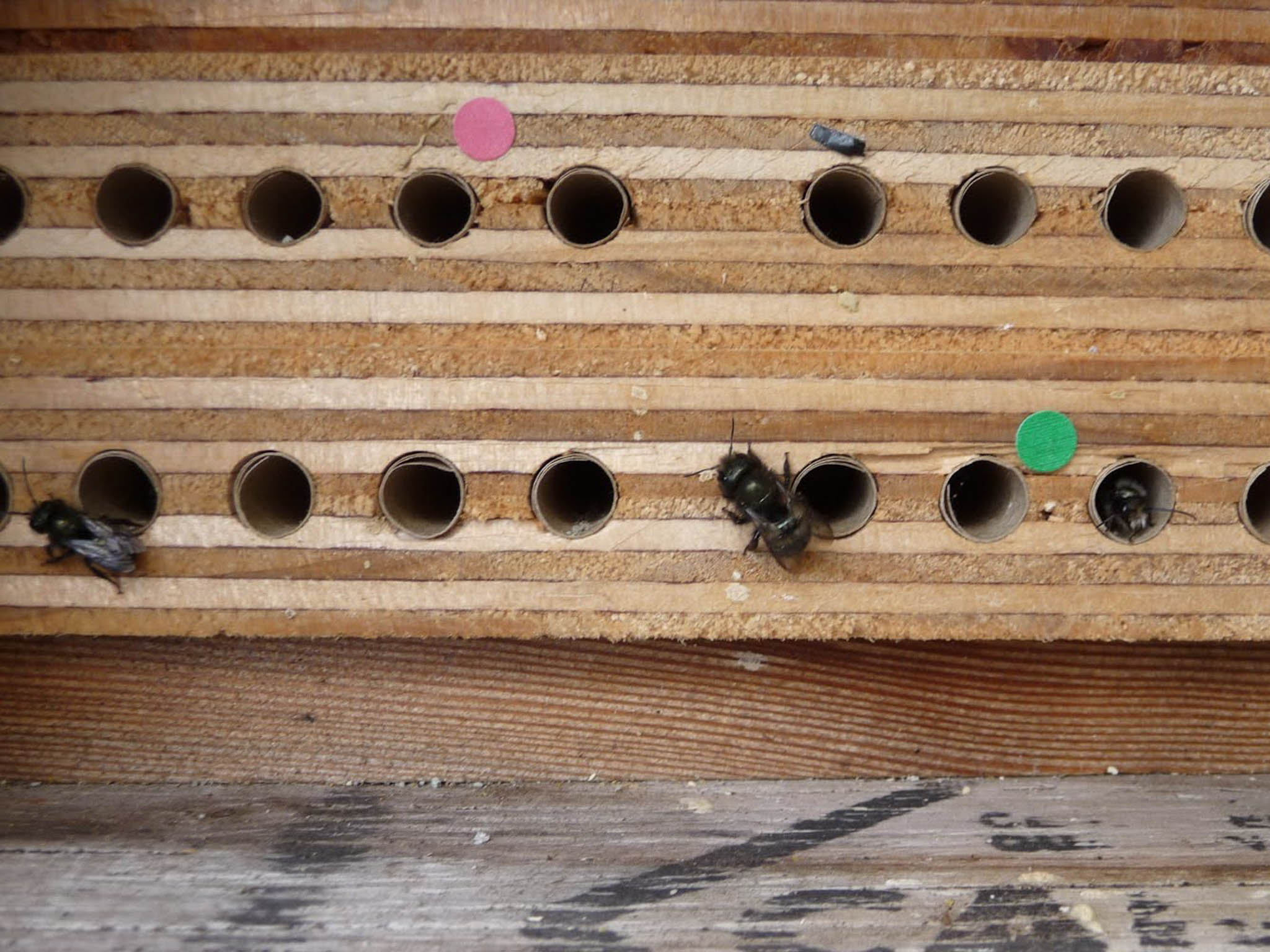 Nest: Most nest in existing holes in wood (some nest in ground). Many will use ‘bee condos’, or will nest in fence posts or wood siding. Mason bees use mud in nest construction. Leafcutter bees use leaves to line nests. Other members of the group use plant hairs, resins, or other materials in nest construction.